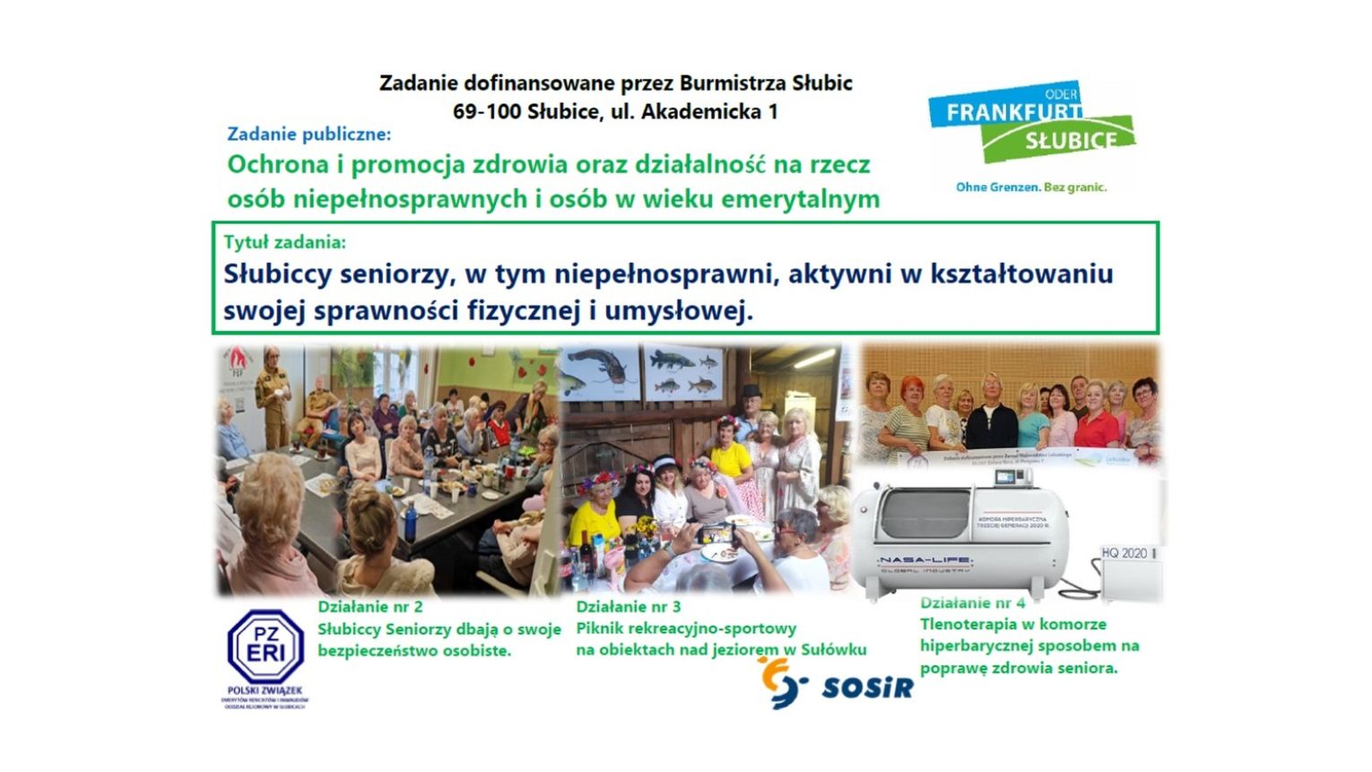 Oddział Rejonowy Polskiego Związku Emerytów, Rencistów i Inwalidów w Słubicach zrealizował projekt mający na celu poprawę bezpieczeństwa, zdrowia i jakości życia osób starszych, w tym niepełnosprawnych. Działania objęły edukację, integrację oraz terapię oddechową. Całkowity koszt realizacji zadania zlożonego z trzech działań, wyniósł 33 200 zł. Z tej kwoty 15 000 zł stanowiło dofinansowanie przekazane przez Burmistrza Słubic, natomiast pozostałe środki, w wysokości 18 200 zł.