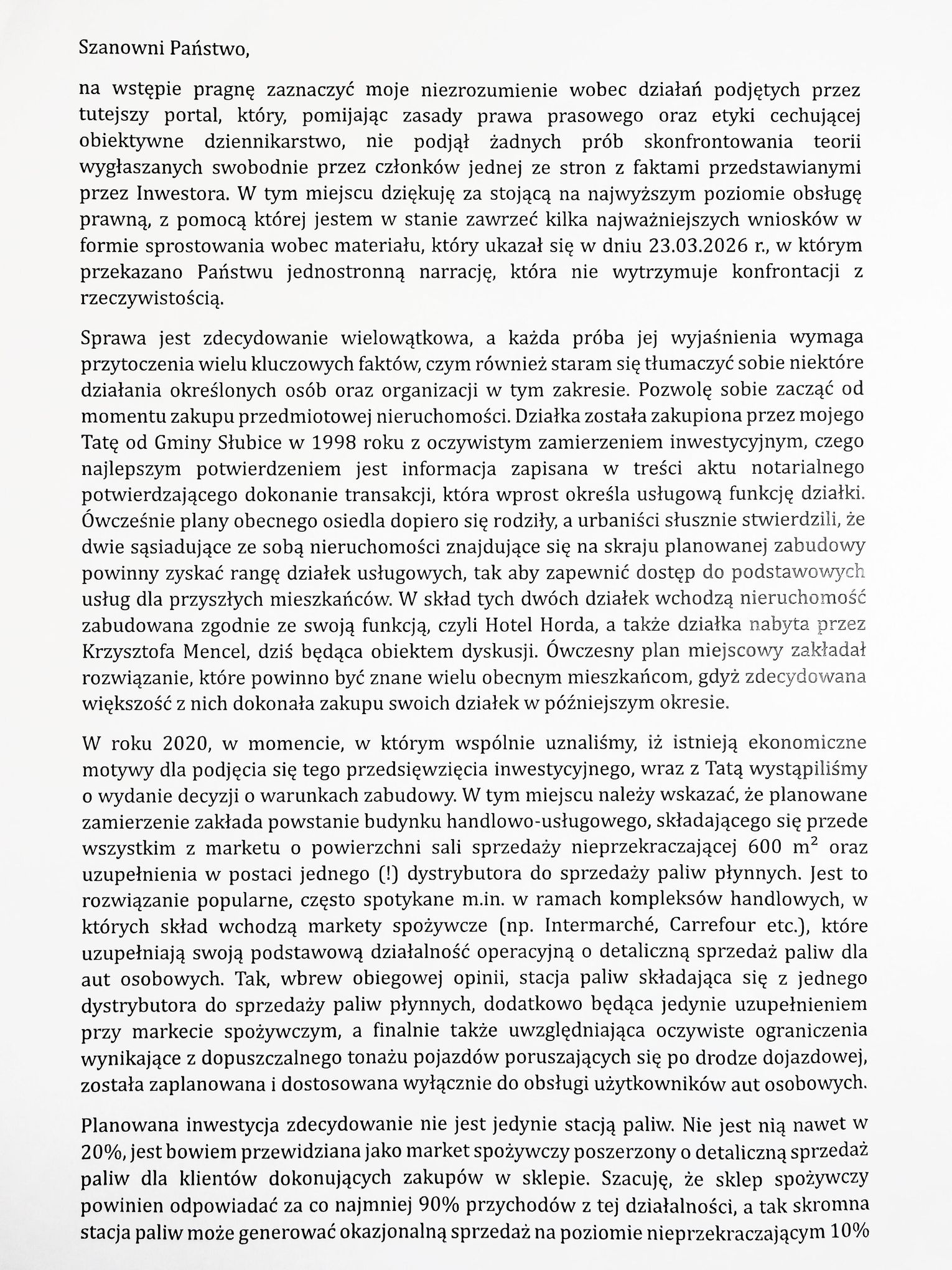 7 kwietnia 2026 roku, listem poleconym dostarczonym przez Pocztę Polską, otrzymaliśmy od PPH Mencel Sp. j. reprezentowaną przez wspólnika Michała Mencel, pismo z „Żądaniem publikacji sprostowania” informacji zawartych w materiale filmowym, pierwotnie opublikowanym w naszych mediach i social mediach dnia 23 marca 2026 roku zatytułowanym: „Protest przeciw planom budowy stacji benzynowej”.