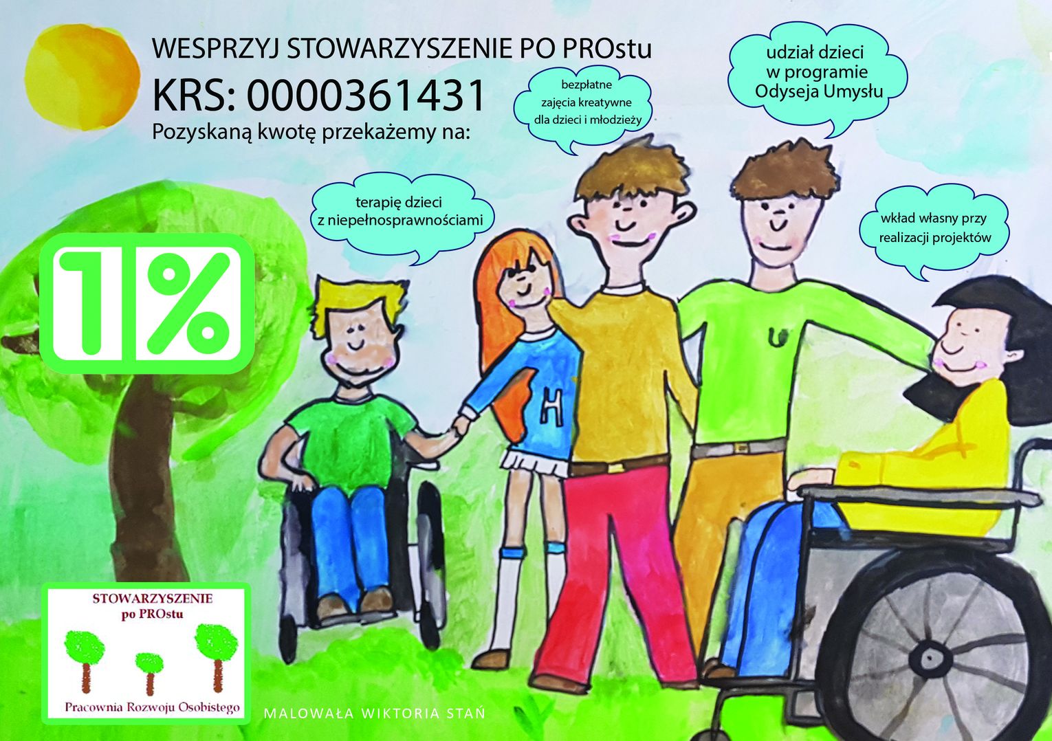 Przekazując 1% podatku Stowarzyszeniu poPROstu wspieracie Państwo działalność stowarzyszenia skierowaną w głównej mierze na terapii zajęciowej na osób niepełnosprawnych. Więcej o Stowarzyszeniu poPROstu mówiliśmy w programie "Rozmowa z... Joanną Sierżant-Rekret", który możecie zobaczyć tutaj.