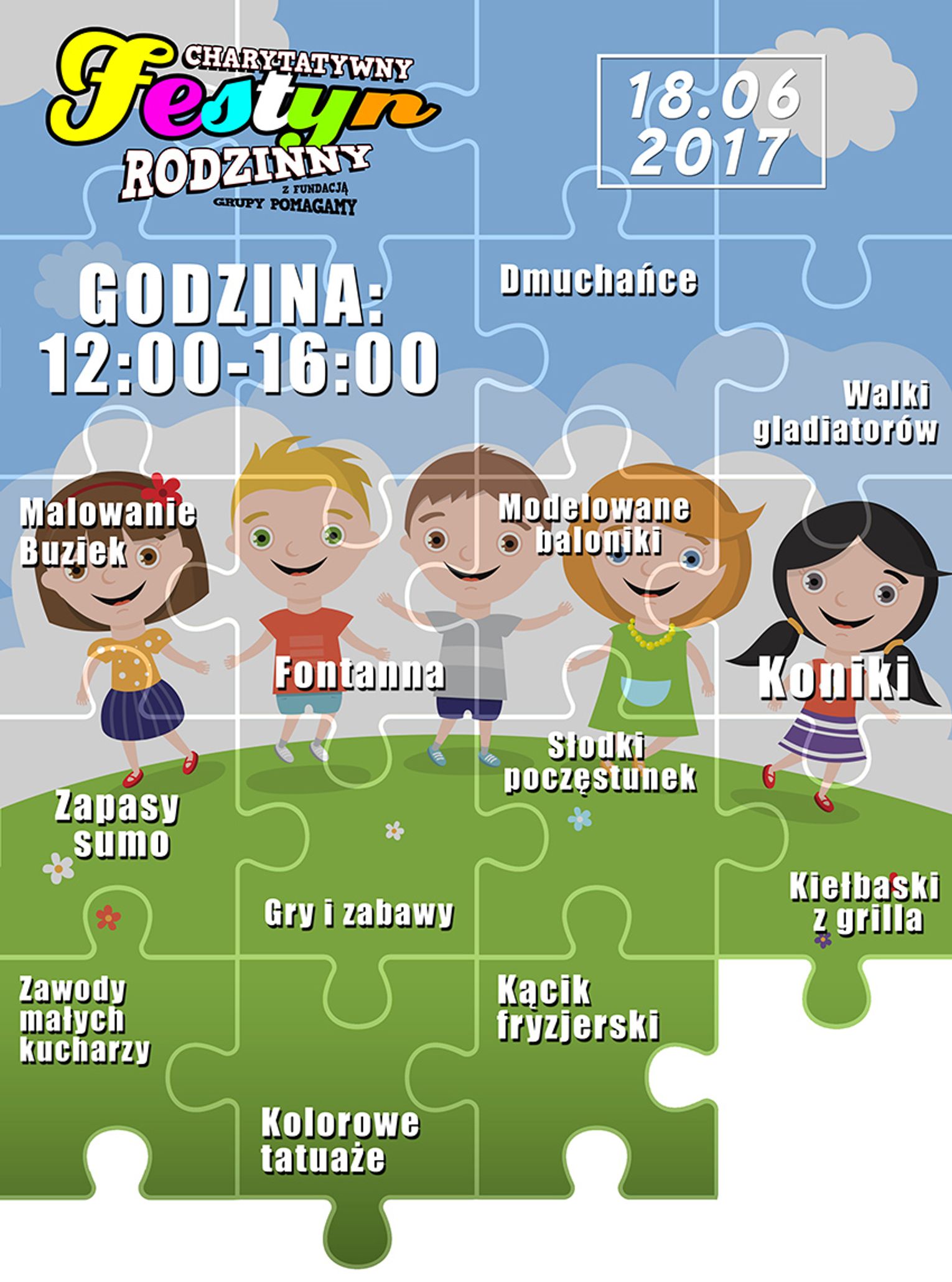 Dzień Dziecka organizowany przez Grupę Pomagamy organizowany jest już po raz trzeci. Tym razem pod hasłem "Charytatywny Festyn Rodzinny". Jak zwykle organizatorzy przygotowali mnóstwo atrakcji dla najmłodszych. A jakie to będą atrakcje będziemy odkrywać każdego dnia w postaci puzzli.