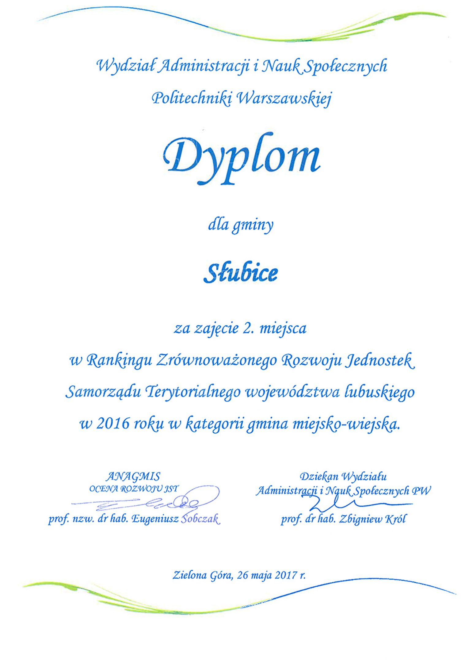 "Klasyfikację oparto na badaniach przeprowadzonych przez zespół prof. nzw. dr hab. Eugeniusza Sobczaka z Wydziału Administracji i Nauk Społecznych Politechniki Warszawskiej." Beata Bielecka rzecznik prasowy słubickiego magistratu.