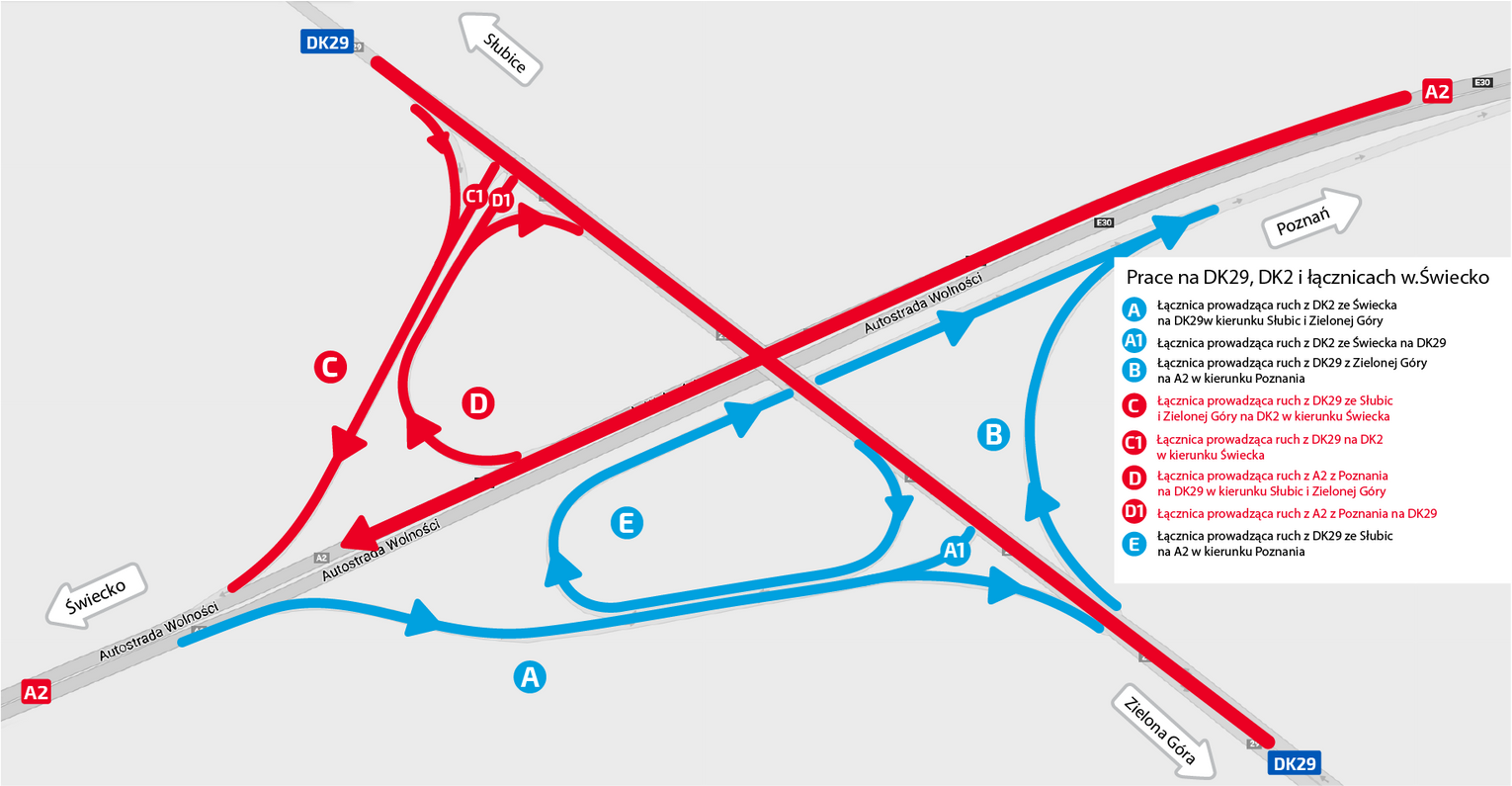 "Prace zorganizowane zostaną na drodze krajowej DK29, wyodrębnionych odcinkach DK2 oraz na łącznicach C, C1, D oraz D1 węzła Świecko. Remont wymienionych obiektów będzie trwać do ok. 17 lipca br. Zostanie wprowadzona tymczasowa organizacja ruchu."- Zuzanna Andrzejewska IdPR Sp. z o.o.