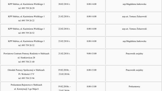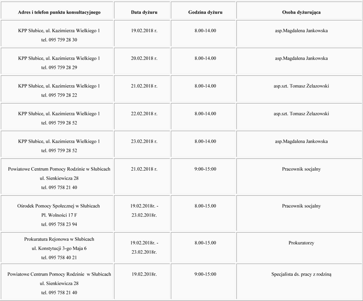 Od 19 do 25 lutego każda osoba fizyczna , której dobro chronione prawem (m.in. życie, zdrowie, godność, wolność, mienie) zostało bezpośrednio naruszone lub zagrożone przez przestępstwo będzie mogła skorzystać z porad i pomocy policjantów ,prokuratorów oraz pracowników społecznych .