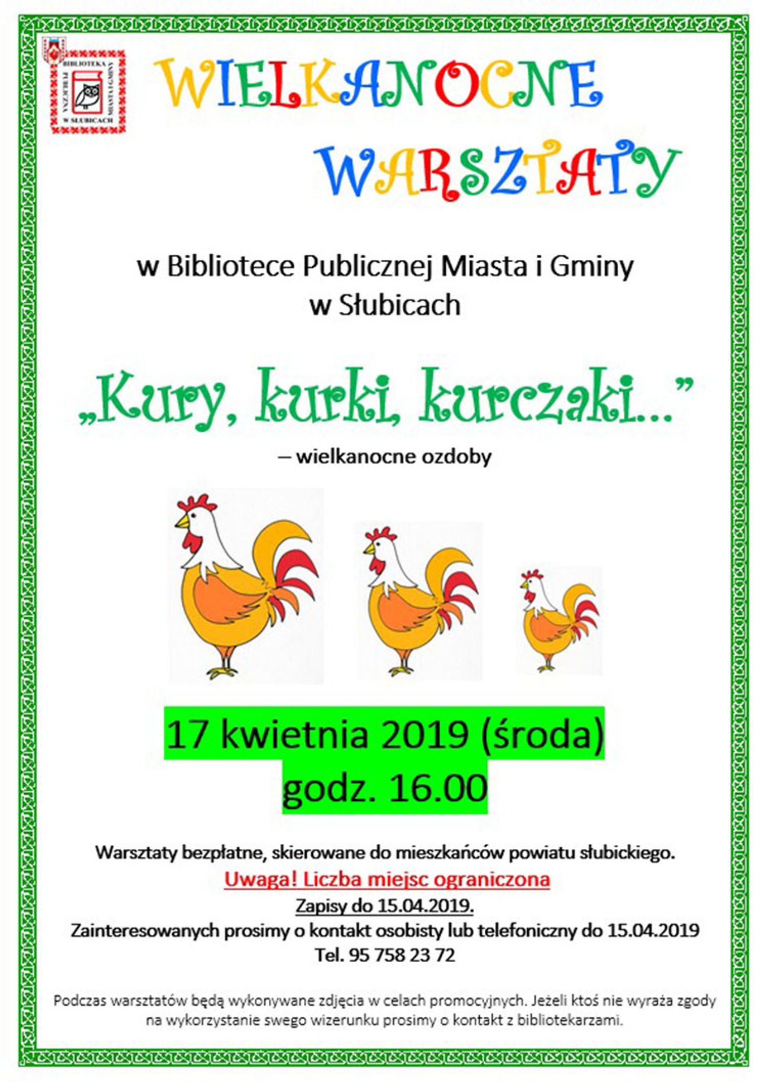 Warsztaty odbędą się 17 kwietnia 2019 r. (środa) o godz. 16.00 w Oddziale dla Dzieci słubickiej biblioteki. Udział w nich jest bezpłatny. Ze względu na ograniczoną liczbę miejsc należy się wcześniej zapisać. Można to zrobić osobiście w bibliotece lub telefonicznie